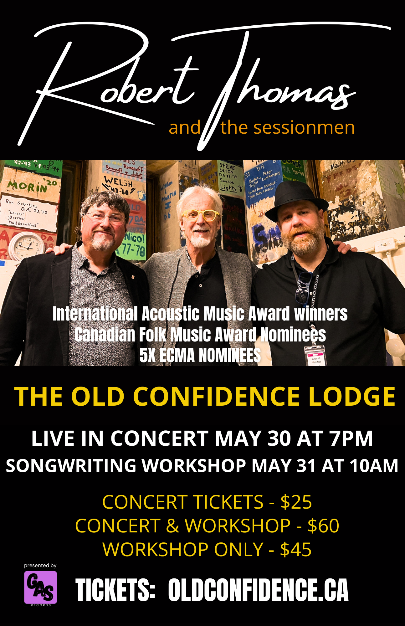 Robert’s creativity is ably matched by his acoustic duo, the sessionmen. Ray Legere (fiddle, mandolin, vocals) may be the most renowned and prolific acoustic musician in the Maritimes. He has performed with Alison Krauss, Tony Rice, Natalie MacMaster, The Chieftans and a host of others. Jon Arsenault (guitar, keyboard, percussion, vocals) is a superb multi-instrumentalist and captivating performer.